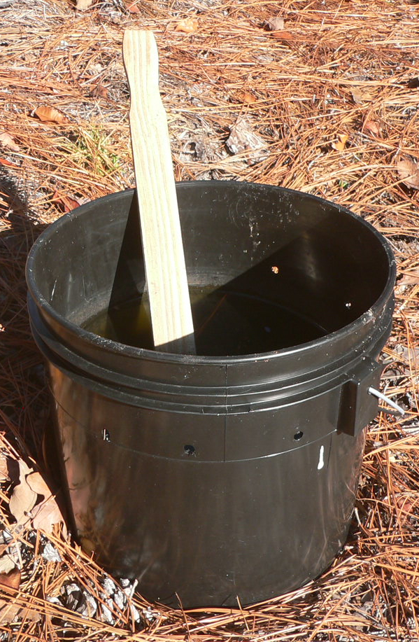 - At least one, small, black (or other dark color), three gallon (or more) bucket2, or other type of container2, preferably with a handle. This is where the mosquito larvae will DIE ! Smaller buckets or containers may be easily blown over by the wind, because they will hold less water. Taller buckets or containers will be heavier to move because of the need for more water (each gallon of water weighs about 8 pounds). The higher water level in a taller bucket won’t allow the needed paint stick to be above the water level in the bucket.